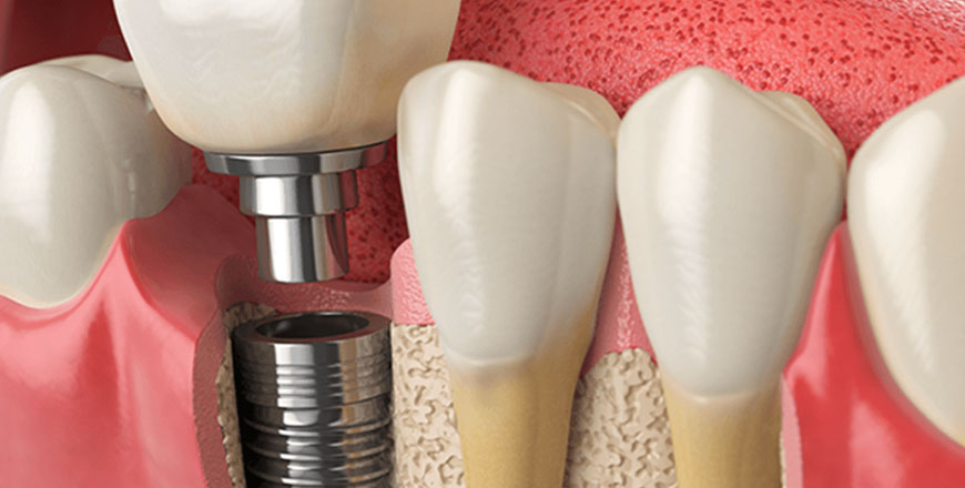 Tratamento com implantes para perdas unitárias ou múltiplas de dentes com recuperação da estética e função mastigatória.